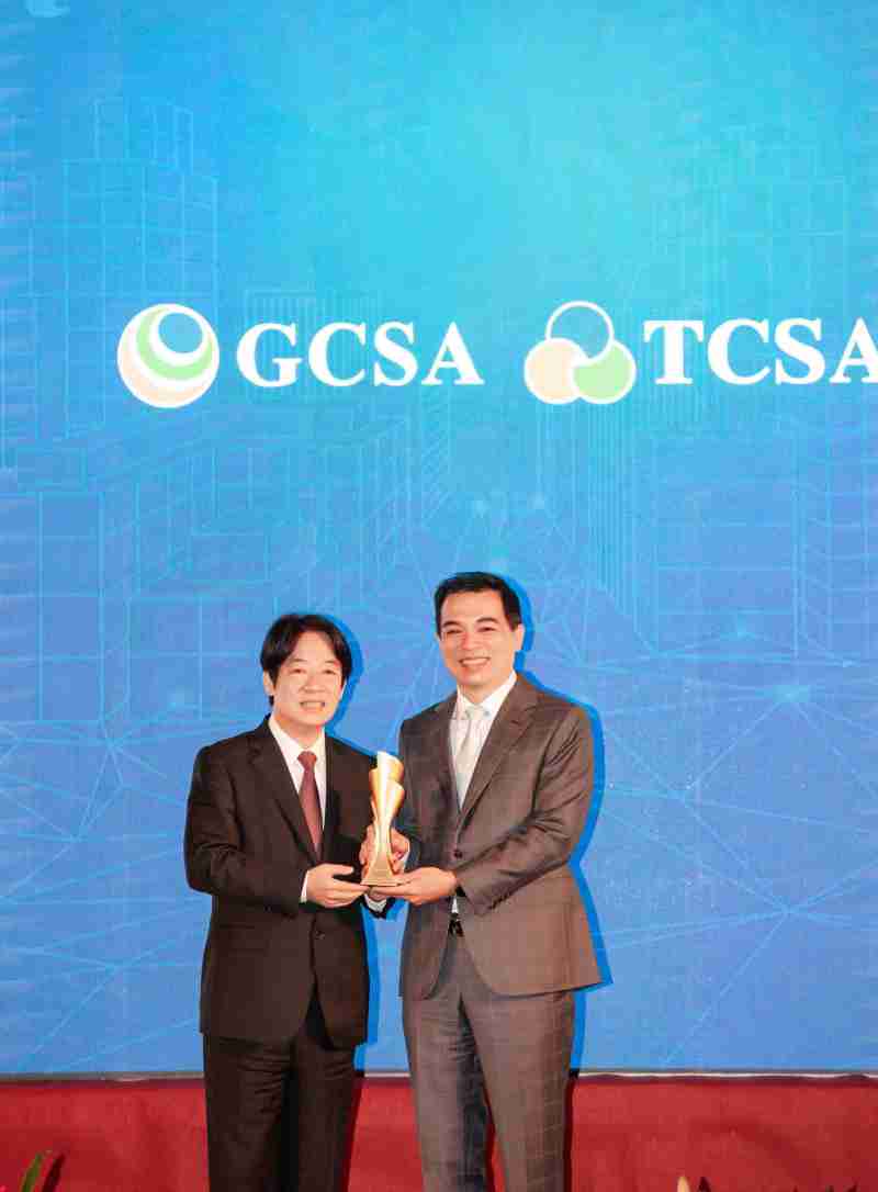 达全方位永续表现获全球永续奖及台湾永续奖肯定,,由副总统赖清德颁奖 (左),,冰球突破总经理柯富仁 (右) 代表领奖