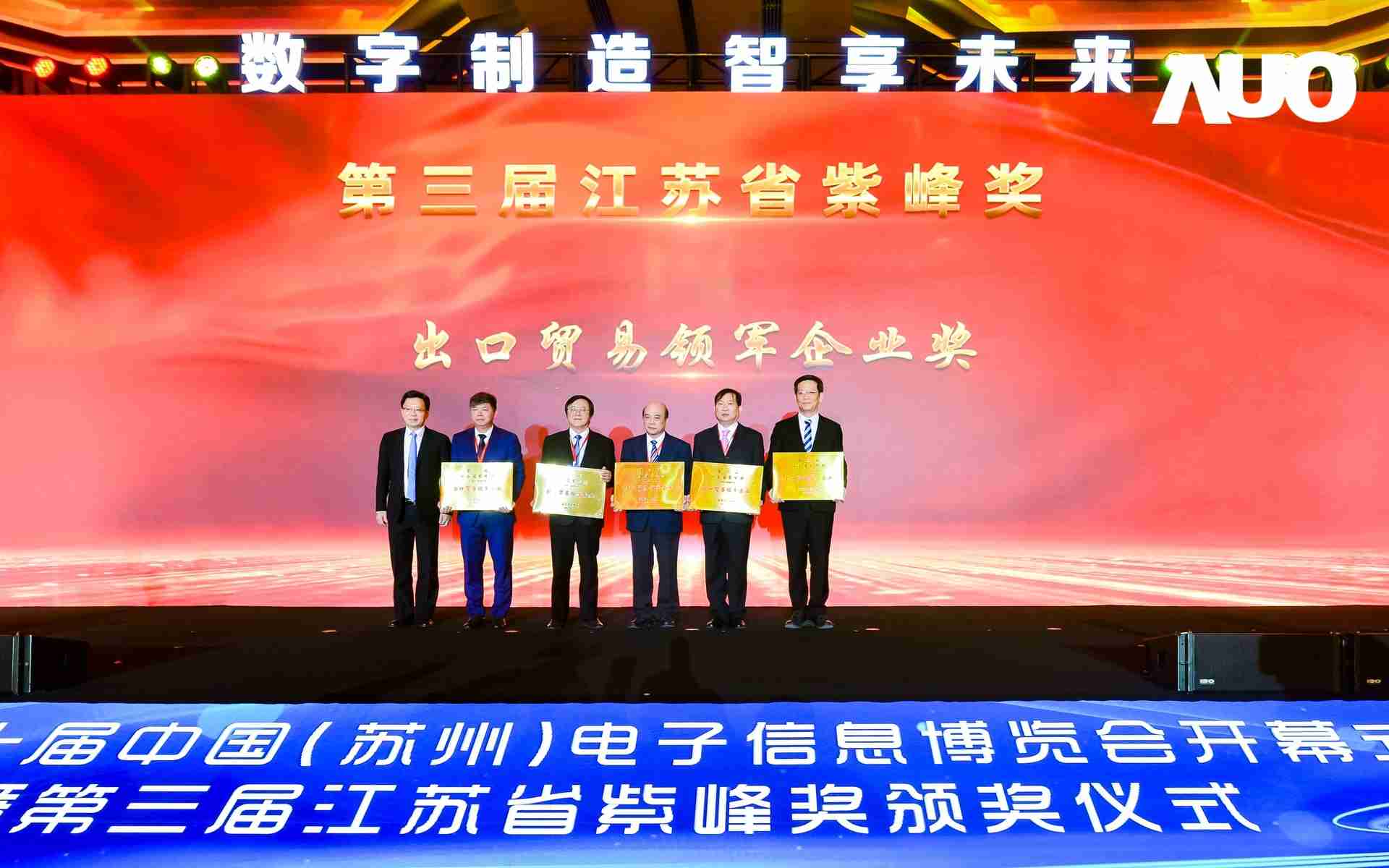 电博会开幕式当天也是第三届江苏省紫峰奖颁奖仪式,,,,省台办、、工信厅、、商务厅、、、苏州市相关领导均出席并颁奖。。。。该奖项为表彰对江苏高质量发展做出积极贡献的在苏企业,,,由江苏省政府专门设立。。。。冰球突破光电 (苏州) 总经理郭振明代表上台领奖,,,这也是冰球突破苏州连续三次蝉联紫峰奖 出口贸易领军企业奖。。。冰球突破数位总经理赵丽娜女士,,,也参与本次开幕式,,,上台为本地化赋能签署战略合作协议,,,将优质服务资源集合、、、下沉到更多细分行业,,,,为更多地区的制造企业提供数字化转型服务。。。